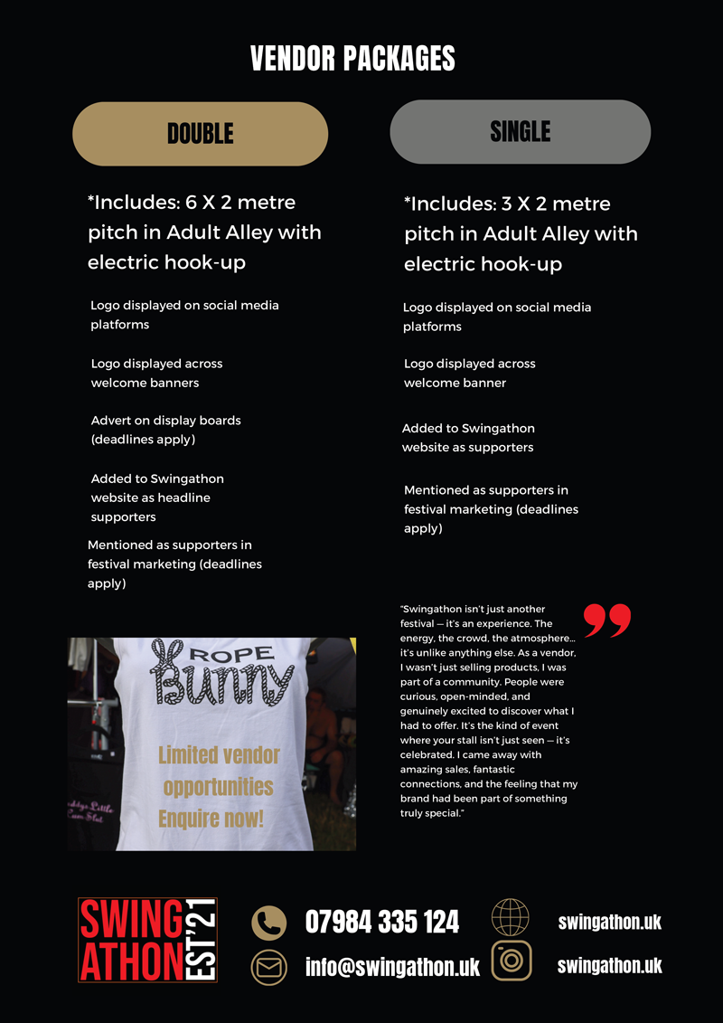 Please read the below and our terms and conditions for entry to the festival as not only will you get an opportunity to sell/market to our wonderful attendees you also get entry to the festival, experiencing everything Swingathon has to offer. With that in mind we are very safety and privacy conscious so if you can fill out the checkout form as comprehensively as possible that would be amazing!